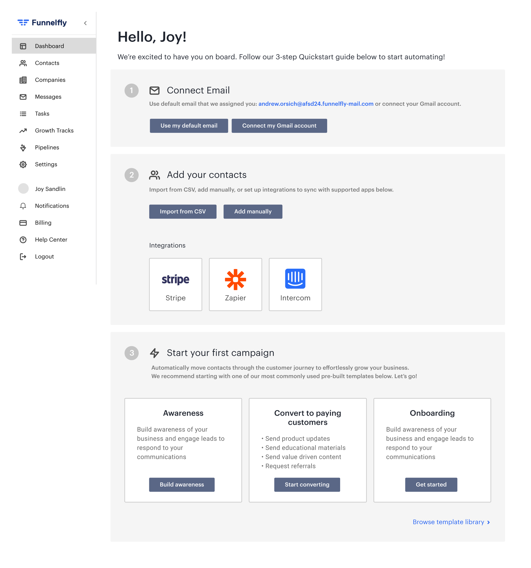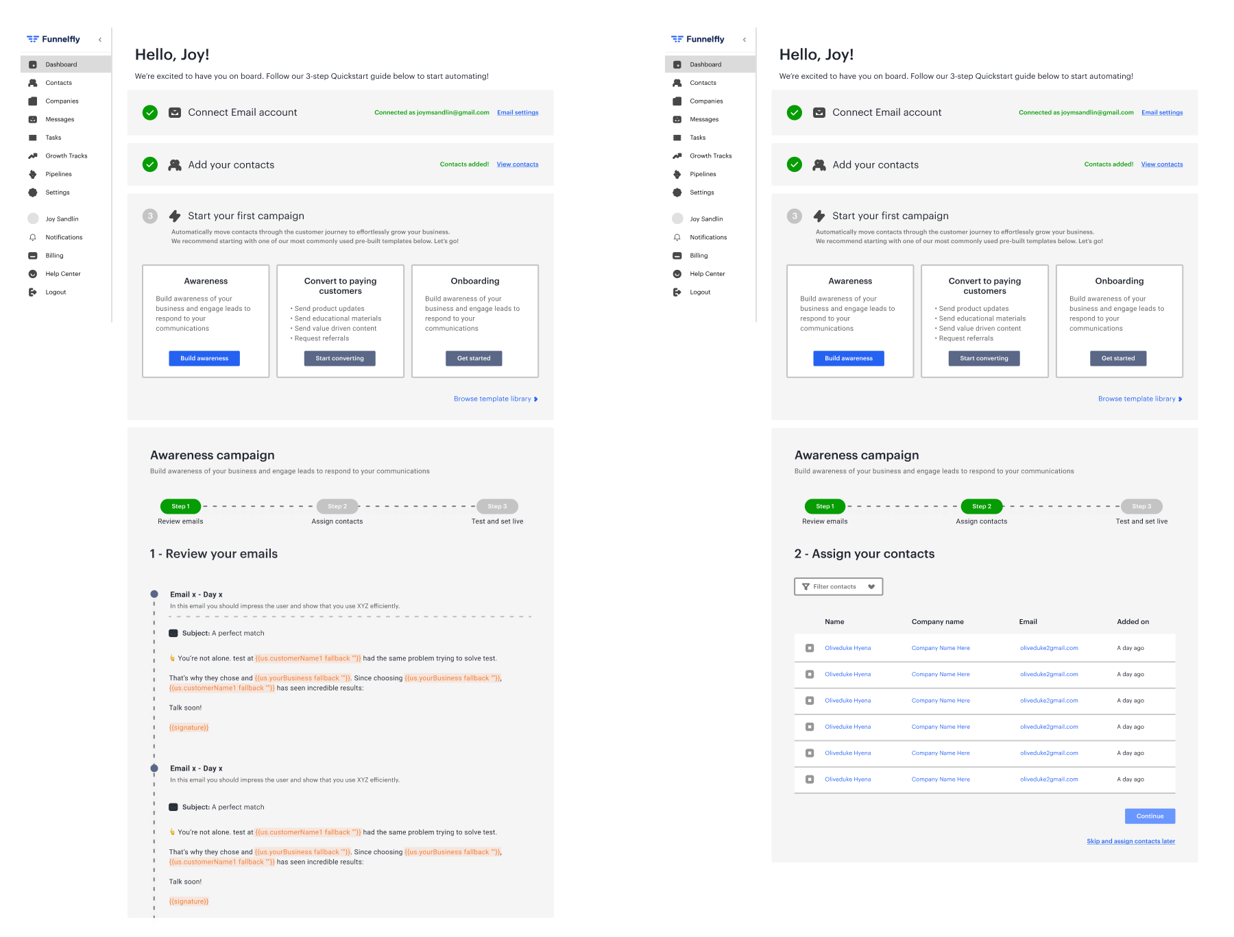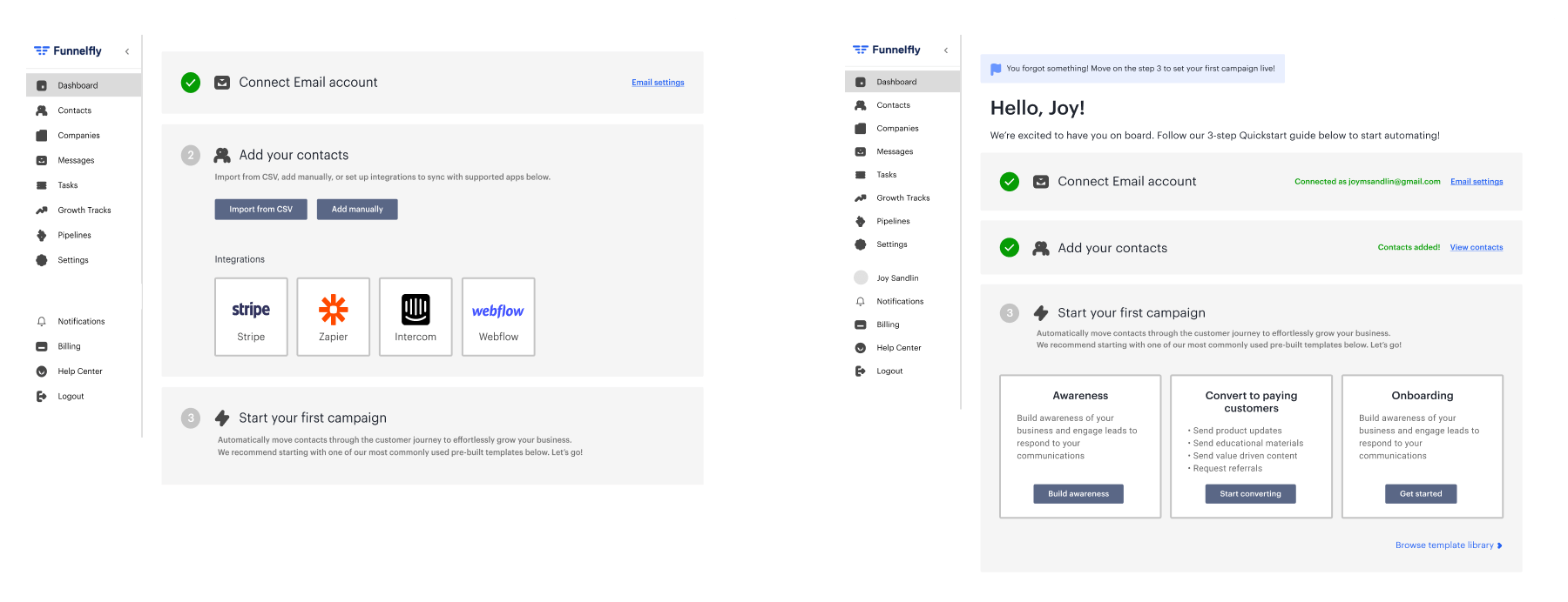 Funnelfly was a SaaS marketing and sales engagement CRM designed for small and medium-sized businesses. In its early phases, I was hired to design a new onboarding interface for the software. The goal was to pare down the UI to make the process easier for clients to start sending marketing emails.