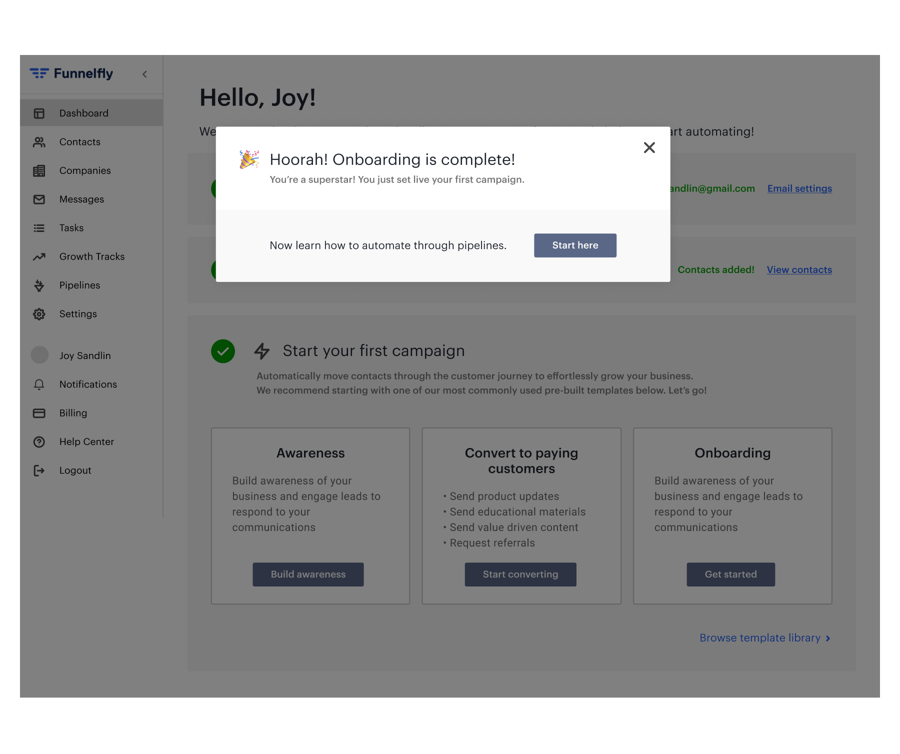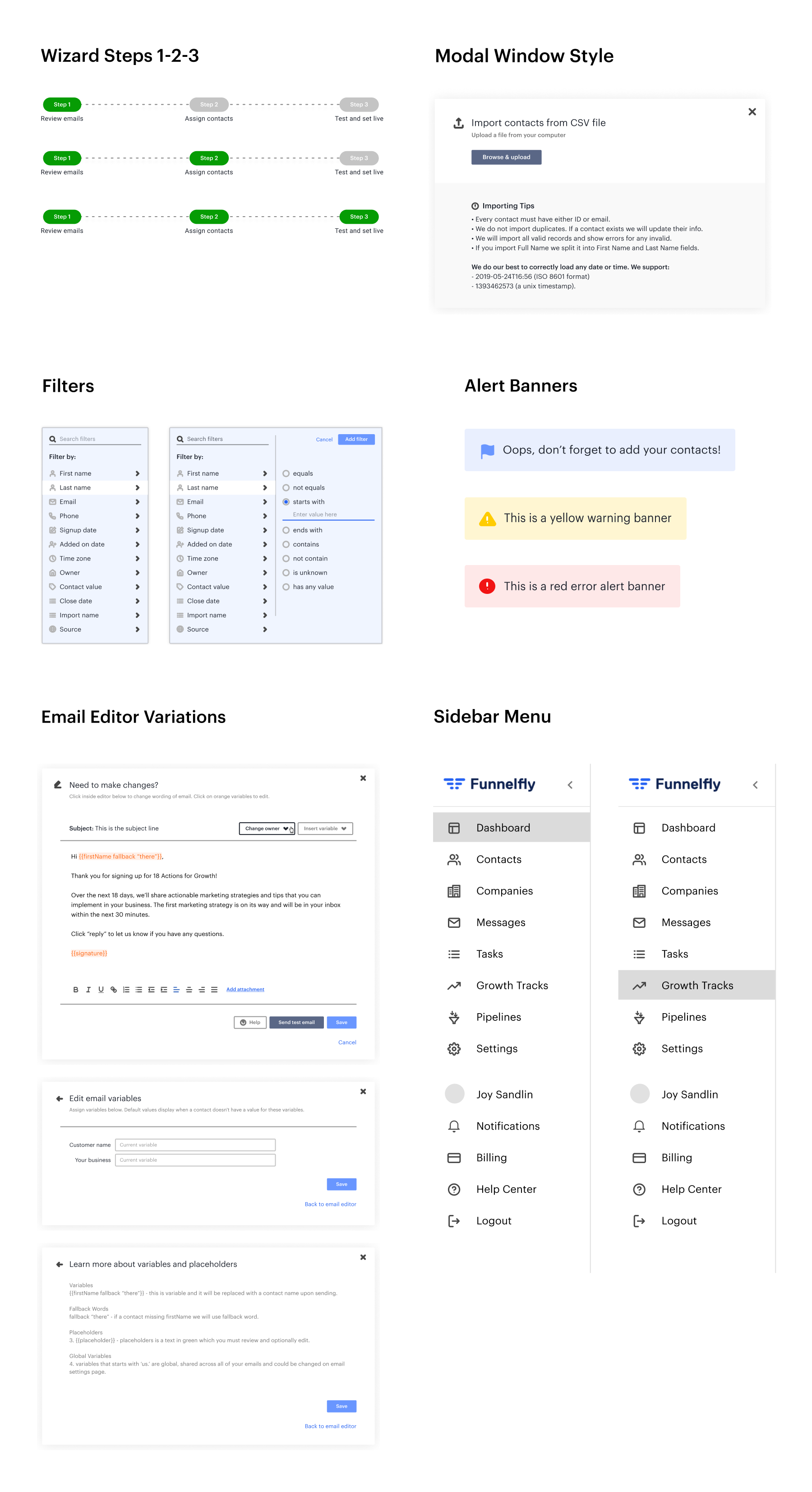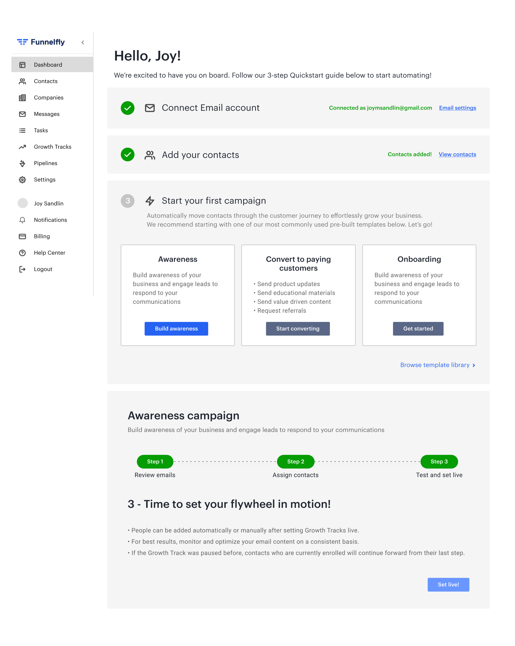 Funnelfly was a SaaS marketing and sales engagement CRM designed for small and medium-sized businesses. In its early phases, I was hired to design a new onboarding interface for the software. The goal was to pare down the UI to make the process easier for clients to start sending marketing emails.